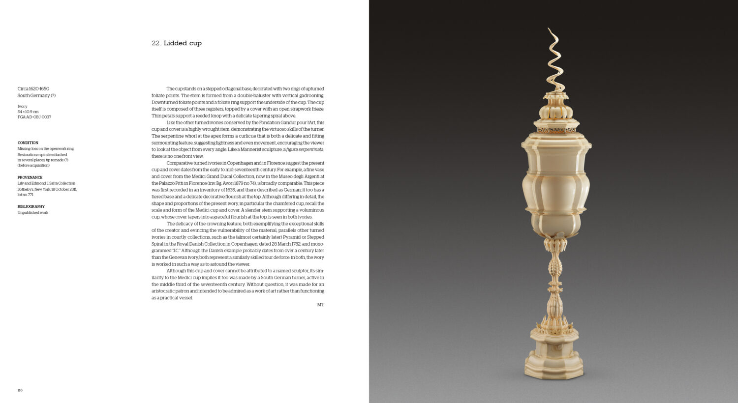 Following a first volume devoted to secular and sacred objects and sculptures from the twelfth to the eighteenth centuries, this second catalogue in the decorative arts collection of the Fondation Gandur pour l’Art focuses specifically on the art of living. Furniture, caskets, boxes, clocks, lamps, turned ivories and gold and silver cups from the dawn of the Renaissance to the end of the Age of Enlightenment provide a panoply of strictly decorative European creativeness.