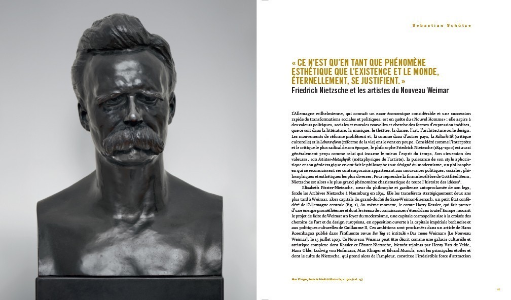 Vers 1900, un petit groupe formé d’influents mécènes, critiques, écrivains et artistes fait de Weimar, capitale du grand-duché de Saxe-Weimar-Eisenach, aujourd’hui en Allemagne, un centre utopiste de l’art et de la pensée modernes. Des artistes tels que Max Klinger, Edvard Munch et Ludwig von Hofmann et des écrivains comme André Gide, Hugo von Hofmannsthal et Rainer Maria Rilke cherchent à créer un « Nouveau Weimar » et désignent à la tête de ce mouvement Friedrich Nietzsche, prophète radical de la modernité. Sa pensée pénétrante, son langage expressif et son style aphoristique saisissant font en effet de lui le parfait philosophe du modernisme. « L’existence et l’univers ne sont éternellement justifiés qu’en tant que phénomène esthétique. » Avec des maximes philosophiques comme celle-ci, tirée de La Naissance de la tragédie, Nietzsche va devenir une référence majeure pour les artistes et les critiques en quête d’un « nouvel art », d’un « nouvel homme » et, finalement, d’une « nouvelle société ».