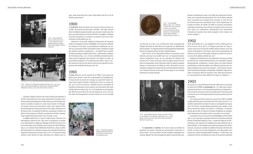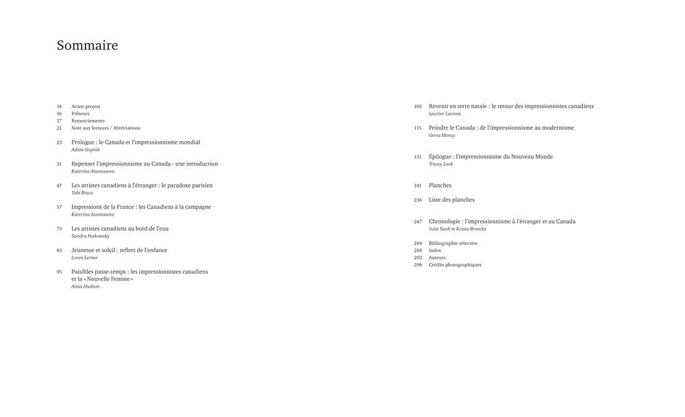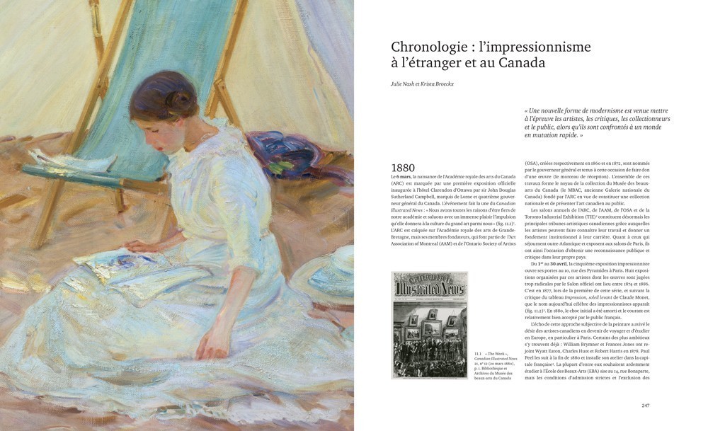 Le livre adopte une approche thématique qui permet au lecteur de suivre les traces des artistes canadiens, dans leur pays comme à l’étranger : leurs études dans les écoles d’art françaises, leurs voyages en Europe, leur participation à de grandes expositions, et notamment aux salons parisiens. Nombre d’entre eux développent évidemment un goût pour la restitution emphatique de l’instant éphémère et pour la recherche de la lumière naturelle, si chère au cœur des impressionnistes français. En rentrant au Canada, ils se retrouvent confrontés à un défi : adapter à la réalité de leur pays ce qu’ils ont vu et appris à l’étranger. Les ambiances hivernales, urbaines ou rurales, deviennent l’un de leurs sujets de prédilection : c’est avec elles qu’ils réussissent à accorder le vocabulaire impressionniste aux paysages canadiens, enveloppés de la lumière caractéristique du nord.