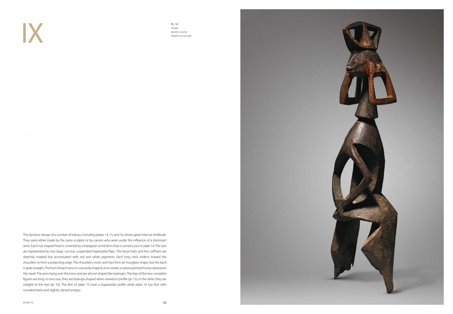 Il faut attendre la fin des années 1960 pour que les statues de la culture des Mumuye, dans le nord-est du Nigeria, apparaissent sur la scène artistique européenne, mais leur impact fut immédiat et profond. Les amateurs d’art africain se sont émerveillés en découvrant l’interprétation abstraite du corps humain par les Mumuye, interprétation qui rappelle l’approche de l’anatomie par les artistes des mouvements cubistes et expressionnistes au début du xxe siècle. De plus, leurs figures sculptées anthropomorphes offrent d’étonnantes variations qui témoignent de la créativité très libre de ces artistes et de leur inventivité sans limites. Une analyse attentive des formes extraordinaires de ces figures – qui dégagent une incroyable impression de mouvement – a conduit àétablir une classification stylistique qui identifie différents ateliers, et même la main de sculpteurs individuels. Dans un résumé des rares études menées sur le terrain, le livre analyse le rôle essentiel de ces figures comme symboles d’un statut et d’un rang social et leurs liens avec la vénération des ancêtres, mais aussi leur utilisation dans les pratiques de guérison et de divination. L’ouvrage propose une sélection de masques et autres objets, mais il se concentre avant tout sur les figures sculptées.