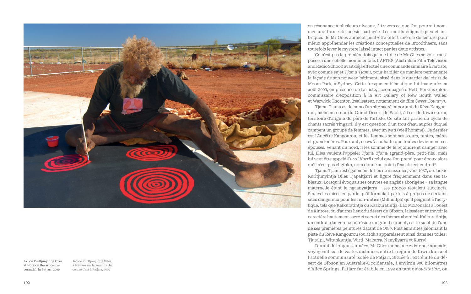 Dal 2017 curatore della Collezione Bérengère Primat e delle mostre d’arte aborigena contemporanea presso la Fondation Opale, Georges Petitjean è storico dell’arte e ha conseguito il dottorato in arte del Deserto Occidentale presso La Trobe University di Melbourne. I suoi principali interessi di ricerca riguardano la transizione dell’arte aborigena australiana dai suoi luoghi d’origine al mondo dell’arte internazionale.