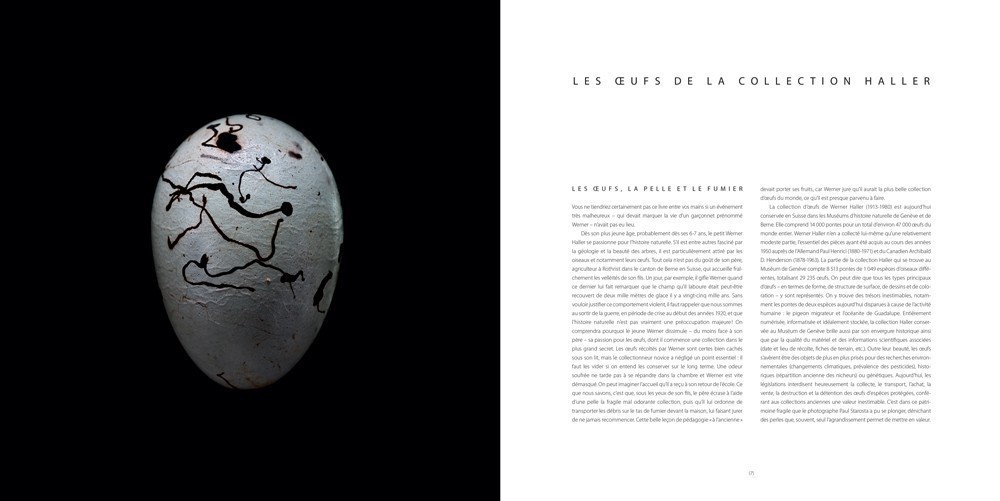 Raccolta la sfida di questi oggetti perfetti che richiedono luci perfette, il fotografo Paul Starosta si è immerso nella collezione Werner Haller di 30.000 uova conservata nel Museo di Storia Naturale di Ginevra. In questo libro trovate il risultato del suo incontro con le uova più belle e magnetiche del mondo.