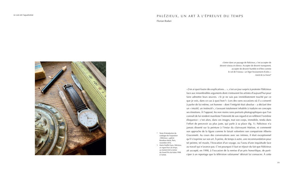 Solitario, istintivo, fedele alle sue emozioni, Palézieux non ha mai smesso di dipingere secondo quanto appreso dai suoi maestri. La sua visione del mondo, estranea a ogni corrente artistica, è tuttavia sorprendentemente precisa e carica di un inedito potere di resistenza. Le sue immagini, dipinte o incise, evocano i luoghi e gli oggetti riflettendo le incertezze del nostro quotidiano. I suoi acquerelli esprimono la forza ineluttabile del tempo contrapponendo contingenze e discorsi personali con un’arte che cerca di riconnettersi, al tempo stesso, con il semplice e l’universale.